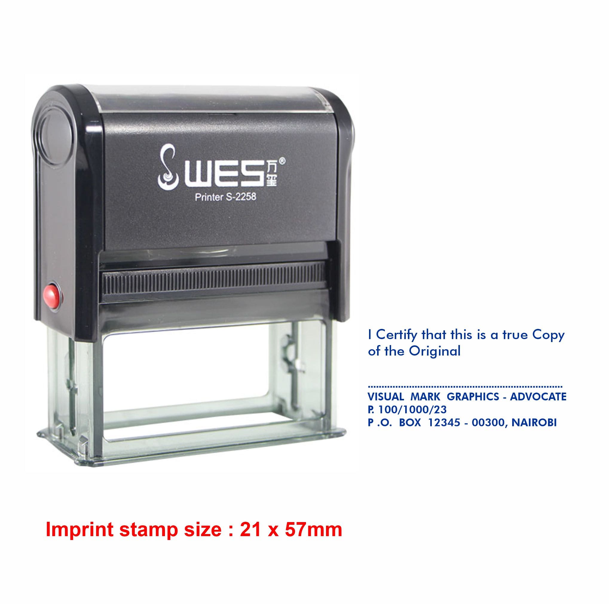 Elevate your professional image with the Wes Printer’s S-2258 Advocate Rubber Stamp – a true copy of the original. Crafted with precision, this stamp ensures crisp and clear impressions, making it an essential tool for legal professionals. Trust Visual Mark Graphics for top-quality rubber stamps that meet the highest standards of authenticity and durability.